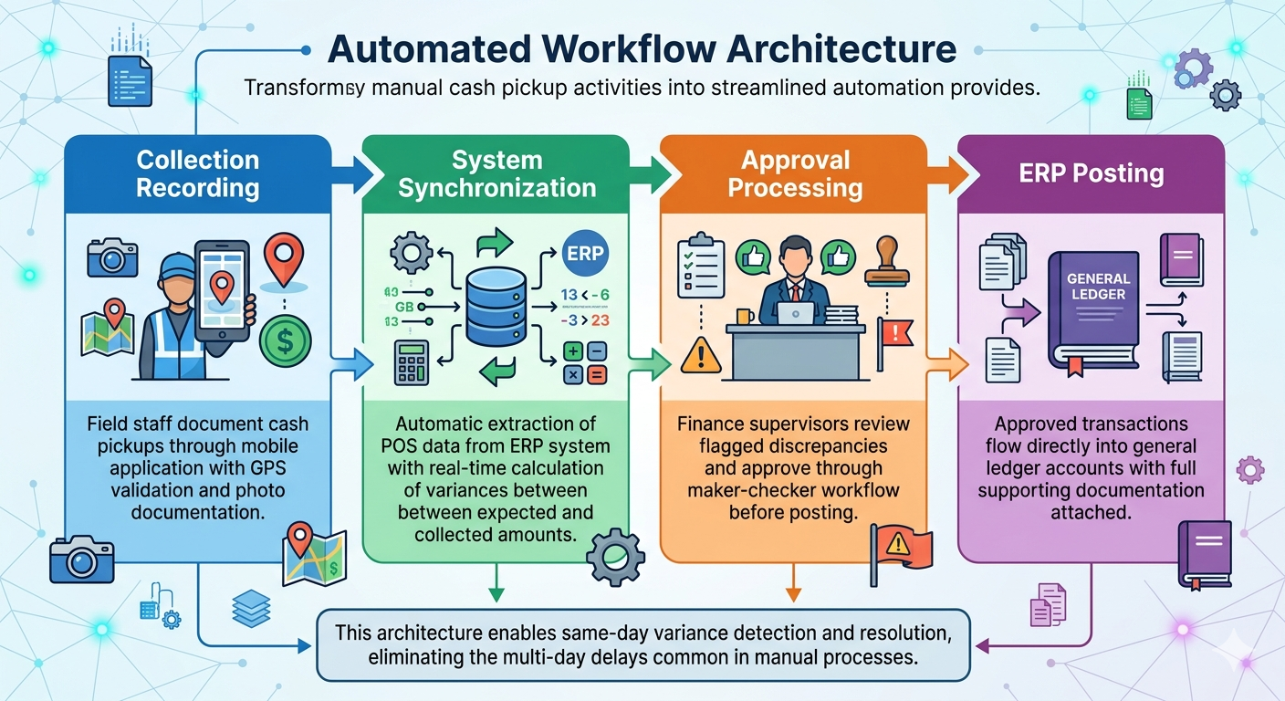 This architecture enables same-day variance detection and resolution, eliminating the multi-day delays common in manual processes.
